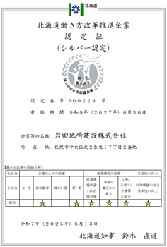 2025年6月13日、北海道が推進する「北海道働き方改革推進企業認定制度」において、シルバー認定を取得しました。