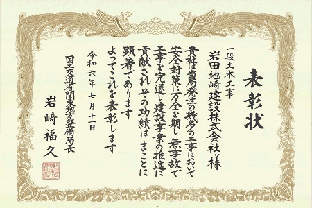 7月11日、さいたま新都心合同庁舎において、関東地方整備局「令和5年度 優良工事等表彰式」が執り行われ、当社は「安全管理優良受注者表彰」を受賞しました。