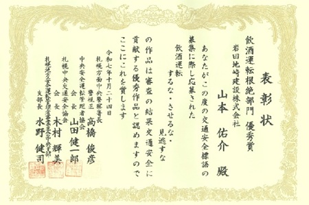 10月24日、札幌中央警察署 道場にて開催された「第13回交通安全標語コンクール」表彰式におきまして、当社社員が応募した標語が優秀賞に選ばれました。