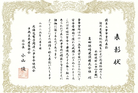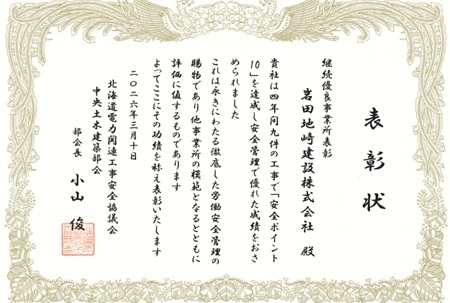 北海道電力関連工事安全協議会が実施している安全パトロールでは、職場における安全確保への取り組みや、労働安全管理の向上に寄与した事業所の中から、特に優秀な成績を収めた事業所に対して表彰が行われています。