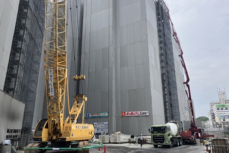 山留工事では、想定以上に地盤が固く、アンギラス工法からオールケーシング工法へ変更したことで施工日数が増加しました。さらに、構造変更により現場打ち杭(全旋回工法)のサイズアップが必要となり、こちらも工期に影響しました。当初計画では杭打機3台での施工を予定していましたが、実際にはスペースの制約から2台での施工となり、結果として当初工程より実働で約120日の遅れが生じました。