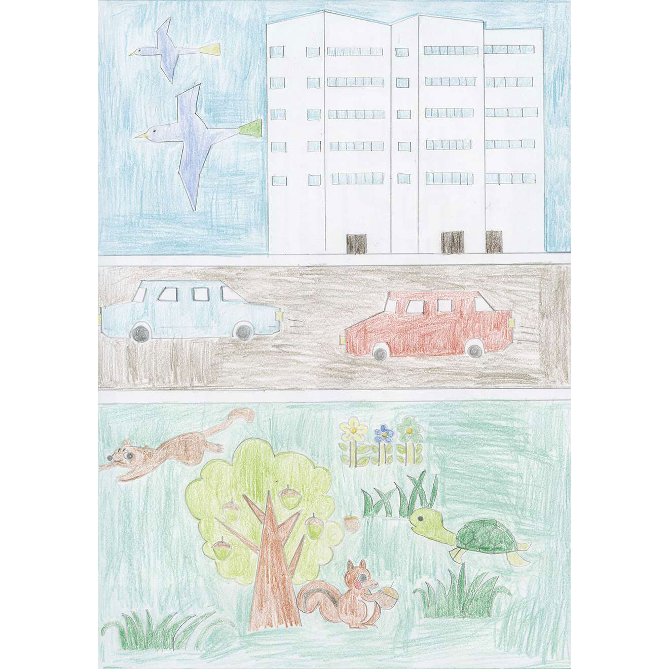 町中に動物がいるようにするためにビルをかいたことです。人間と動物が共存しているようにした。