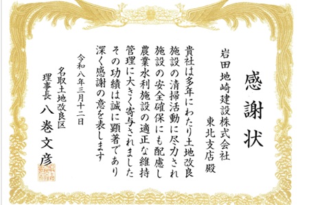 3月12日、多年にわたる継続的な取り組みが評価され、名取土地改良区 理事長より功労者表彰として感謝状が授与されました。