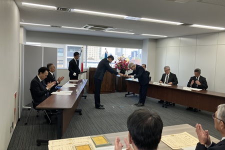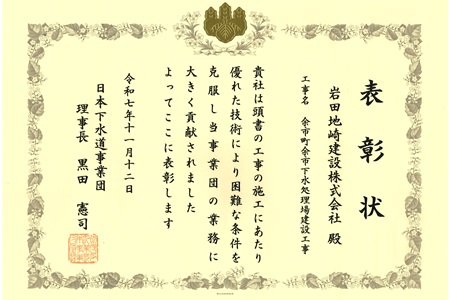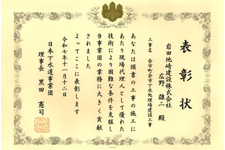 11月12日、日本下水道事業団 本社において、令和7年度 日本下水道事業団表彰式が執り行われ、余市町余市下水処理場建設工事ならびに広野 雄二所長がそれぞれ優良工事表彰および優良工事技術者表彰を受賞しました。