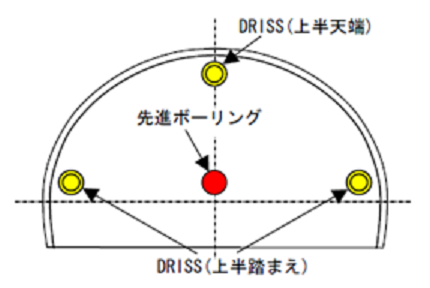 可燃性ガスの発生は、炭層、旧坑道(空洞)や地層境界、破砕帯及び地下水滞水箇所と密接に関係しています。これらを事前に調査・把握するため切羽前方探査「DRISS」を実施しました。探査は1サイクルを切羽から延長30mで3箇所穿孔して、トンネル全線で実施しました。