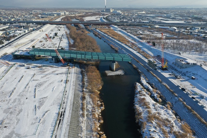 札幌市東区と札幌市白石区をつなぐ橋長318.7m、4径間連続鋼細幅箱桁橋のうち、本工事は上部工4径間の内、河川区域の2径間の鋼桁架設工事。